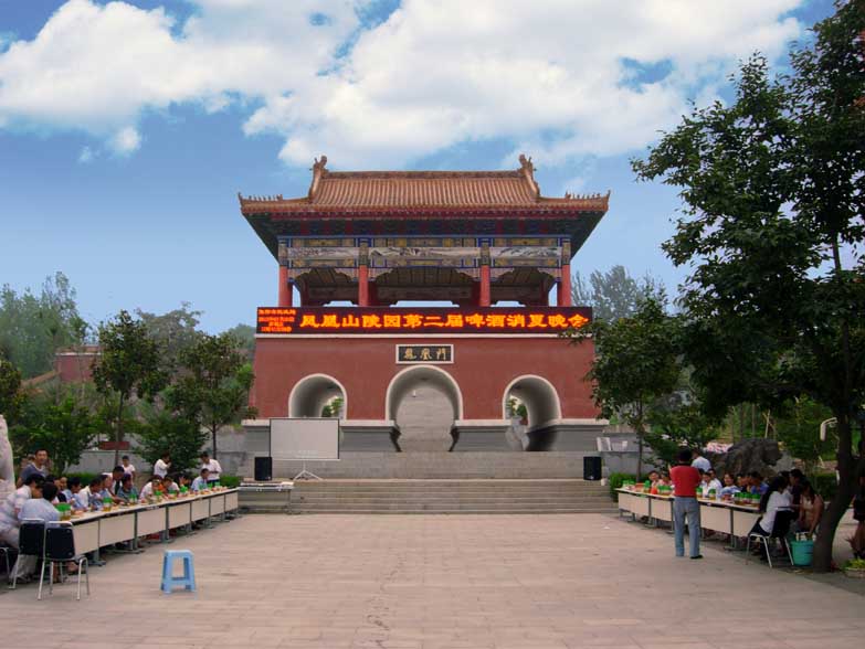 为迎接 “八一”建军节八十五周年的到来,7月20日晚,在陵园凤凰门前分左右两列将桌子排开,桌子上摆放着水果、花生和啤酒。结束了一天辛劳后的员工们享用着美食和啤酒,所有的劳累与烦恼都一扫而光,心情舒畅地等待着晚会。